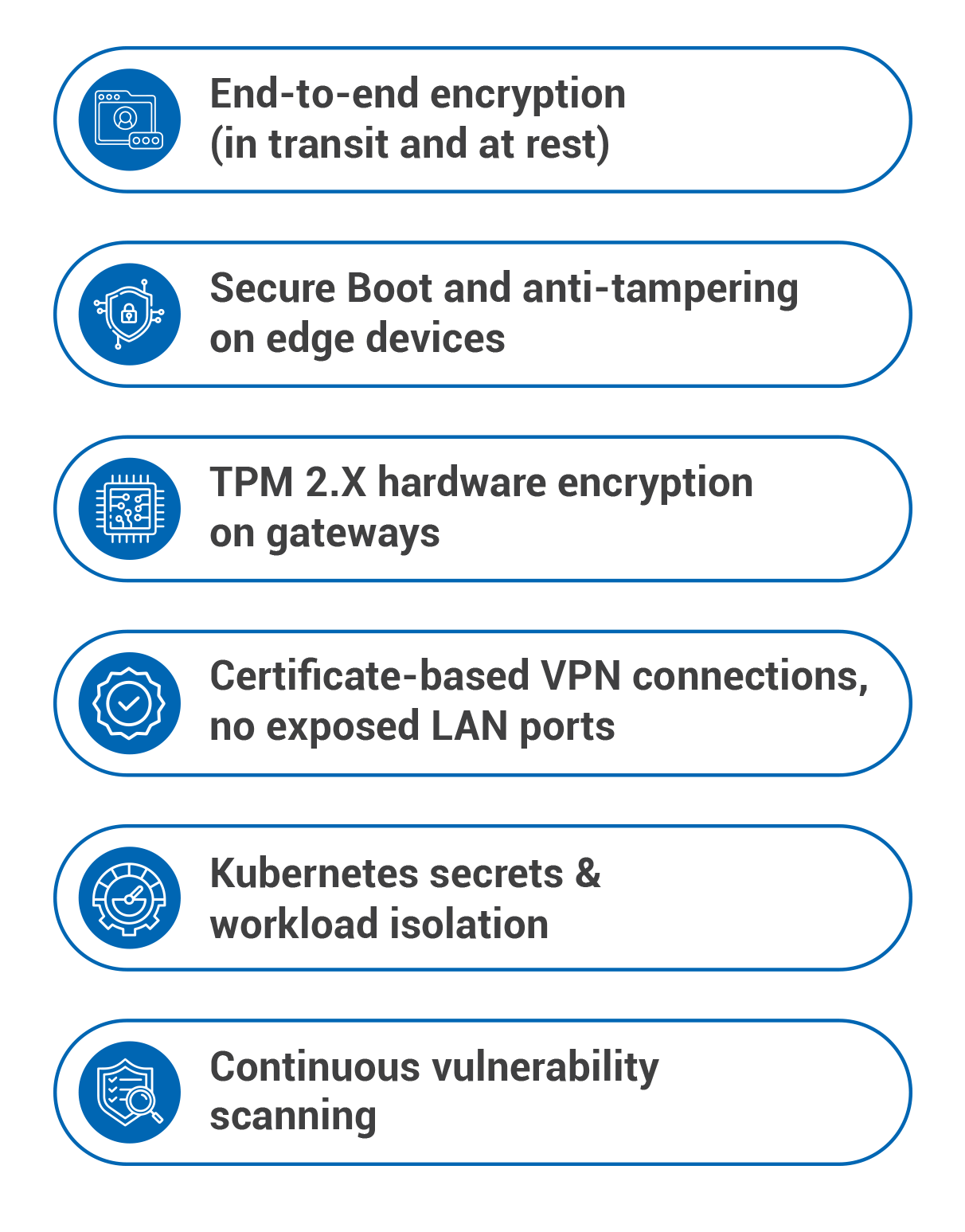 Security is embedded throughout the entire iLCS stack. At the edge, remote devices are equipped with ATSHA encryption chips, secure boot mechanisms and anti-tampering protections to prevent unauthorised access. Gateways add another layer of defence with TPM 2.0 hardware encryption, VPNs with digital certificates and the absence of exposed LAN ports, ensuring communications remain fully protected. In the cloud, security continues with end-to-end encryption both in transit and at rest, Kubernetes secrets for credential management, workload isolation and continuous vulnerability scanning. This multilayered approach makes iLCS one of the most secure IoT platforms available today.
